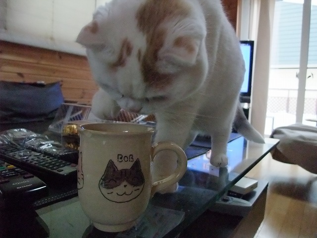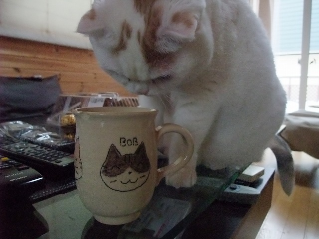 かわいいNEKO3のマグカップを見つめるモモちゃん