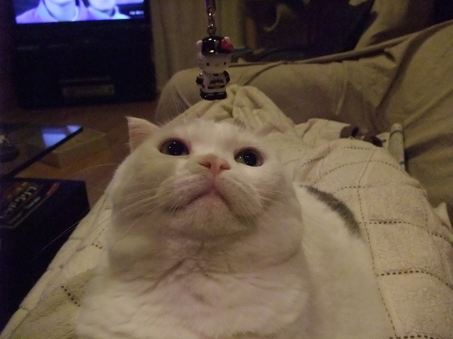モモちゃん、テレビ台のスピーカーのまん前でこれな~に~?と言う顔をしている