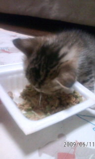 ミーちゃんの飼い主さんのお母さんが、ふやかしたカリカリを出してくれました。