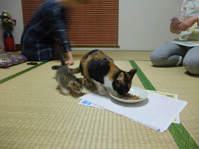 でも、子猫たちが食べたあと、ミーちゃんも食べてました(笑)